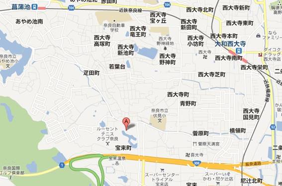 近鉄奈良線、学園前駅南口下車、36系統菖蒲池循環乗車約15分、